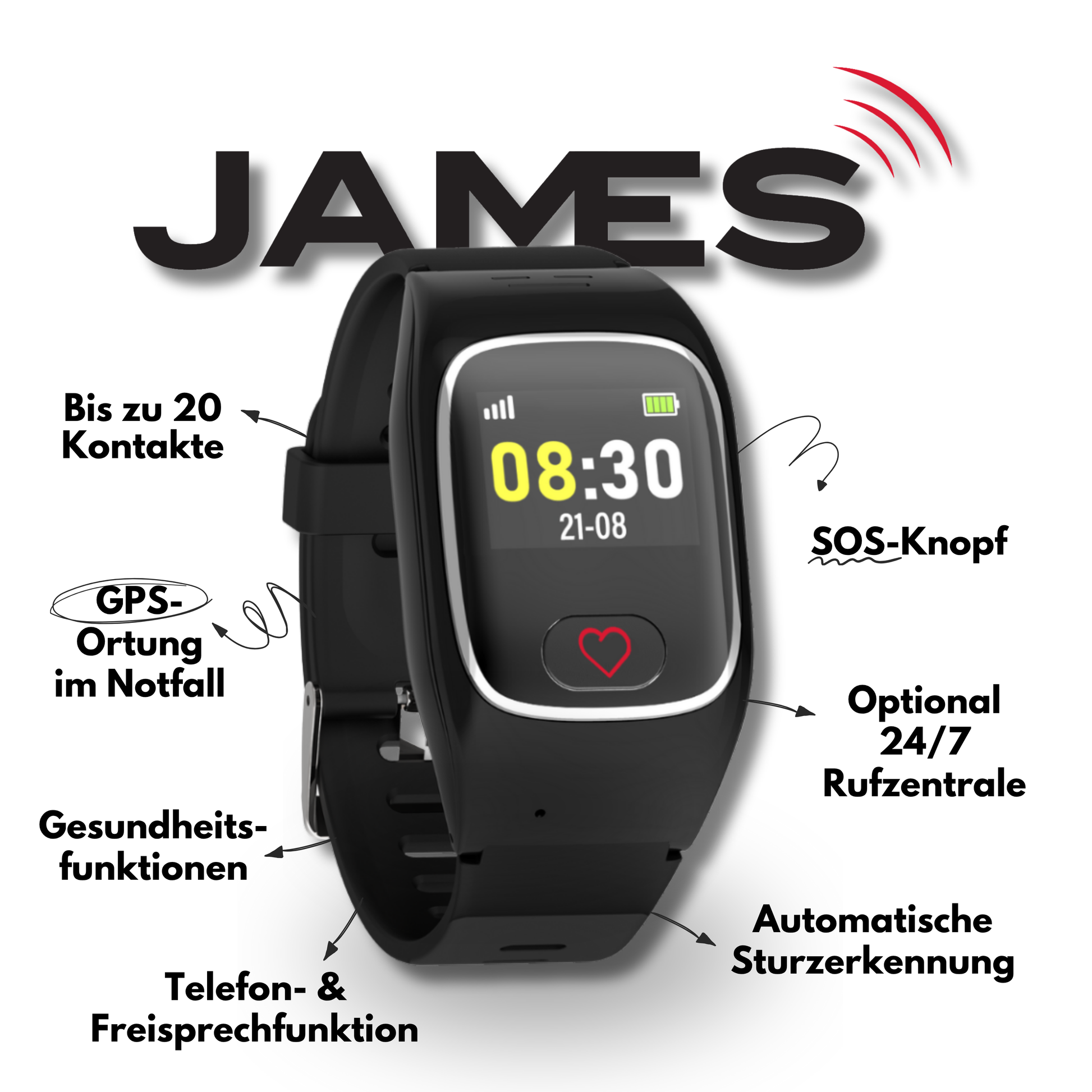 Die zuverlässige Sicherheitsuhr James Notrufuhr B8 beruht auf ein europäisches Notrufsystem, die persönlichen Daten bleiben geschützt. Mehr Sicherheit im Alltag: